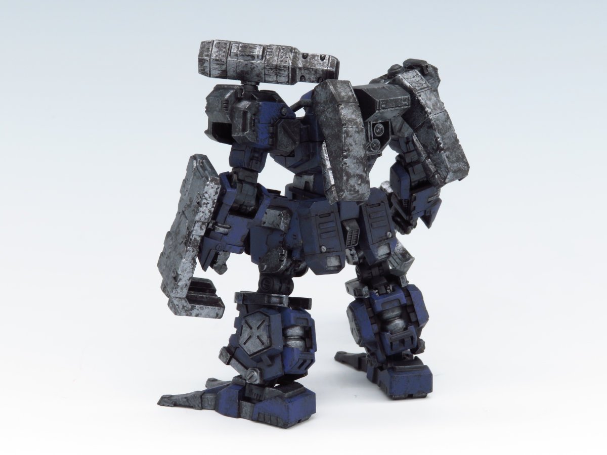 スタッフコメント:パーフェクトソルジャー専用として設計されたATで、スナッピングタートルと同じくイプシロンの乗機として青色の塗装が特徴的な機体ですね!機体のエッジ部分はチッピングとウェザリングにより塗装剥げや錆、煤けた感じが出てます!背面のバーニアや左手のクローなど金属感も本物みたいで素晴らしいです!