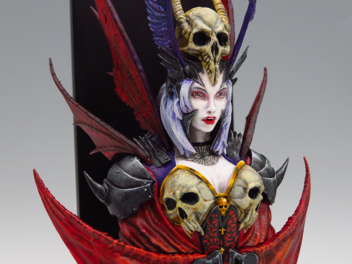 スタッフコメント:まず目に飛び込んでくる真っ赤なマントは、塗れた様な雰囲気の重たい革の質感が彼女の高貴さを醸し出してくれています!金属部のノンメタリックメタル塗装や骸骨の描き込みも素晴らしく、蜘蛛の巣も手描きとの事で緻密な筆のタッチで魅せる一作となっていますね!