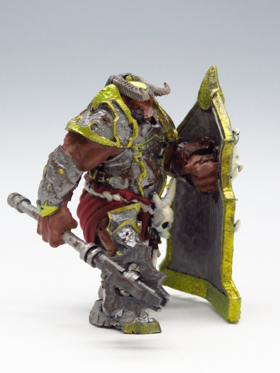 スタッフコメント:どっしりと構えた盾がかっこいいですね!金属部分の真鍮色の再現がギラッと輝いており、錆びた表現が装備の使い込みを感じさせてくれています! 顔のムッとした表情を引き立てる赤っぽい肌の塗りや、鋭い牙など細かな部分への塗装も素晴らしいです!