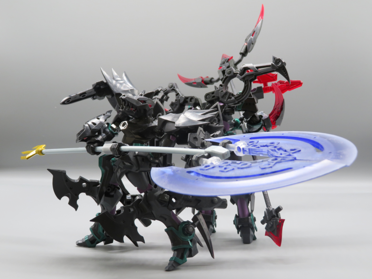 スタッフコメント:背中合わせで異なる武器を構えた2人からは強者の風格と互いの信頼を感じます。ソルジャーアーマーVの狼の頭部を人型のフォルムに違和感無く組み合わせるセンスにも脱帽です!