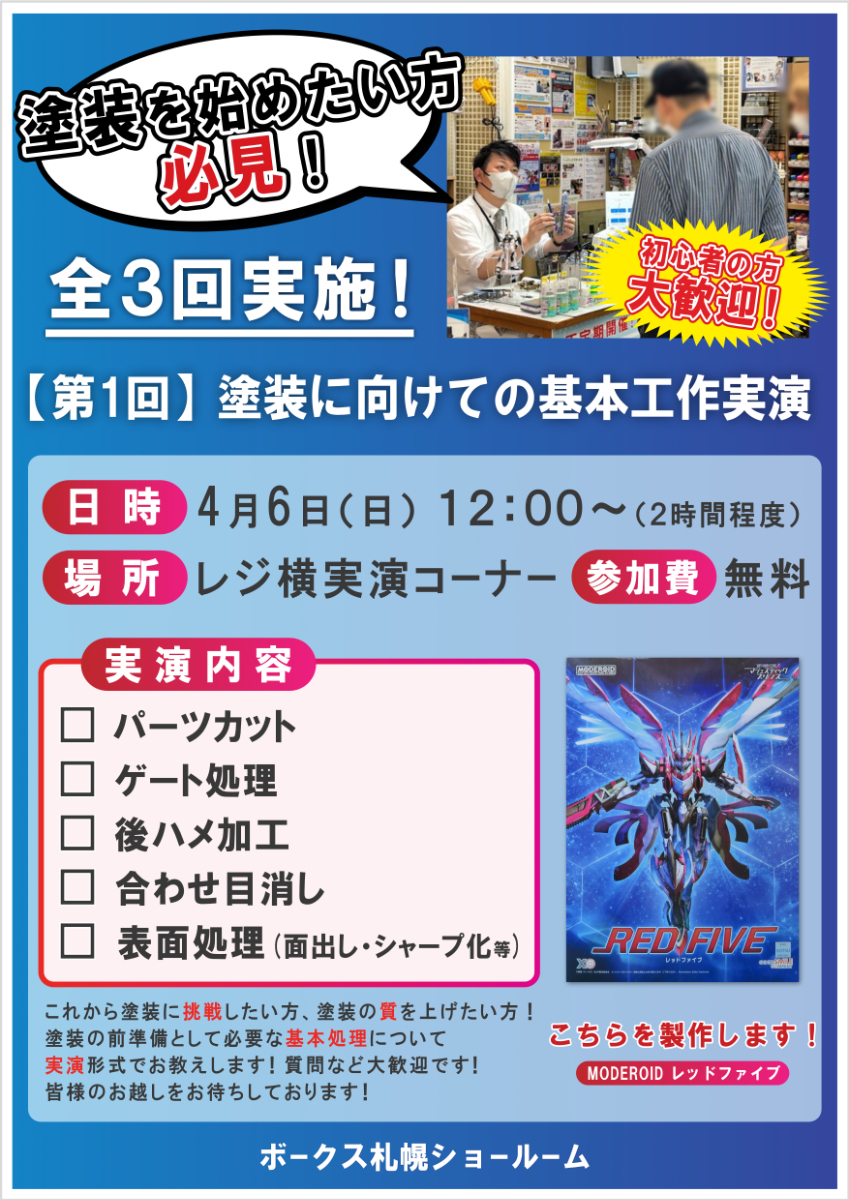全3回を予定しており、第1回は「MODEROIDレッドファイブ」を使って、ゲート処理から合わせ目消しとそれに伴う後ハメ加工、表面処理まで実演します。