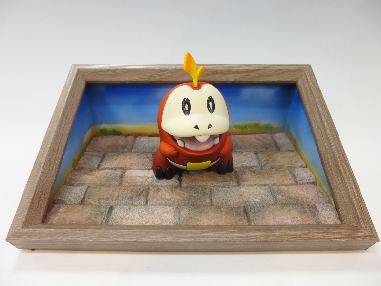 コメント:思い出を立体的に額縁へ納めてみました。赤系の色を7色使ってグラデーションにしています。目にも4色使い、レジンでかためています。ジオラマもファレホで塗装しています。