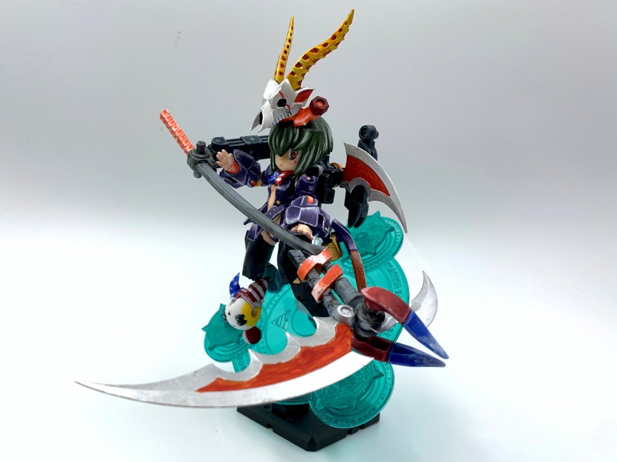 巨大な鎌、エッジの利いた翼に長く伸びる角......。攻撃性を感じさせながらも星条旗を彷彿とさせる配色で遊び心とかわいらしさもプラスされた機体です。光源を意識させるハイライト塗装も見事です。