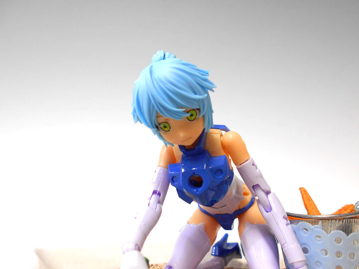 角皿の砂浜にオプションパーツの「ヴィオラ用シャープネスヘアセット」をかぶせたプリムラ・ヴィクトリアのフェイスがついたFIOREが潮干狩りをしている情景です。