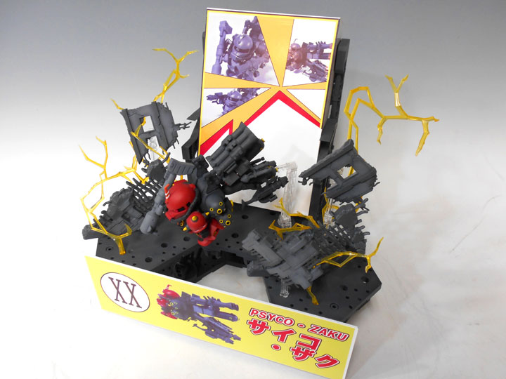「BB戦士No.29ジョニーライデンザクを使用してサイコ・ザクを製作しました。当時のパッケージをイメージした背景とアクションベースやエフェクトパーツを各種使用してサンダーボルトの世界観と30年前のBB戦士を融合させました。