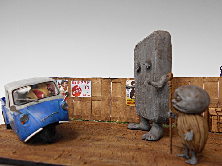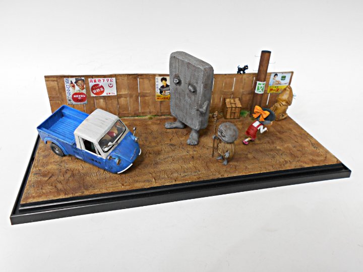 勿論それだけでなく、木箱など小物類のリアルさ、水木ワールドに登場するサラリーマン(オヤジ)の見事な表情、地面や電柱の昭和感溢れる塗装、そして原作の色合いに忠実な猫娘、ねずみ男、油すましの塗装など、もはや隙の無い仕上がり。