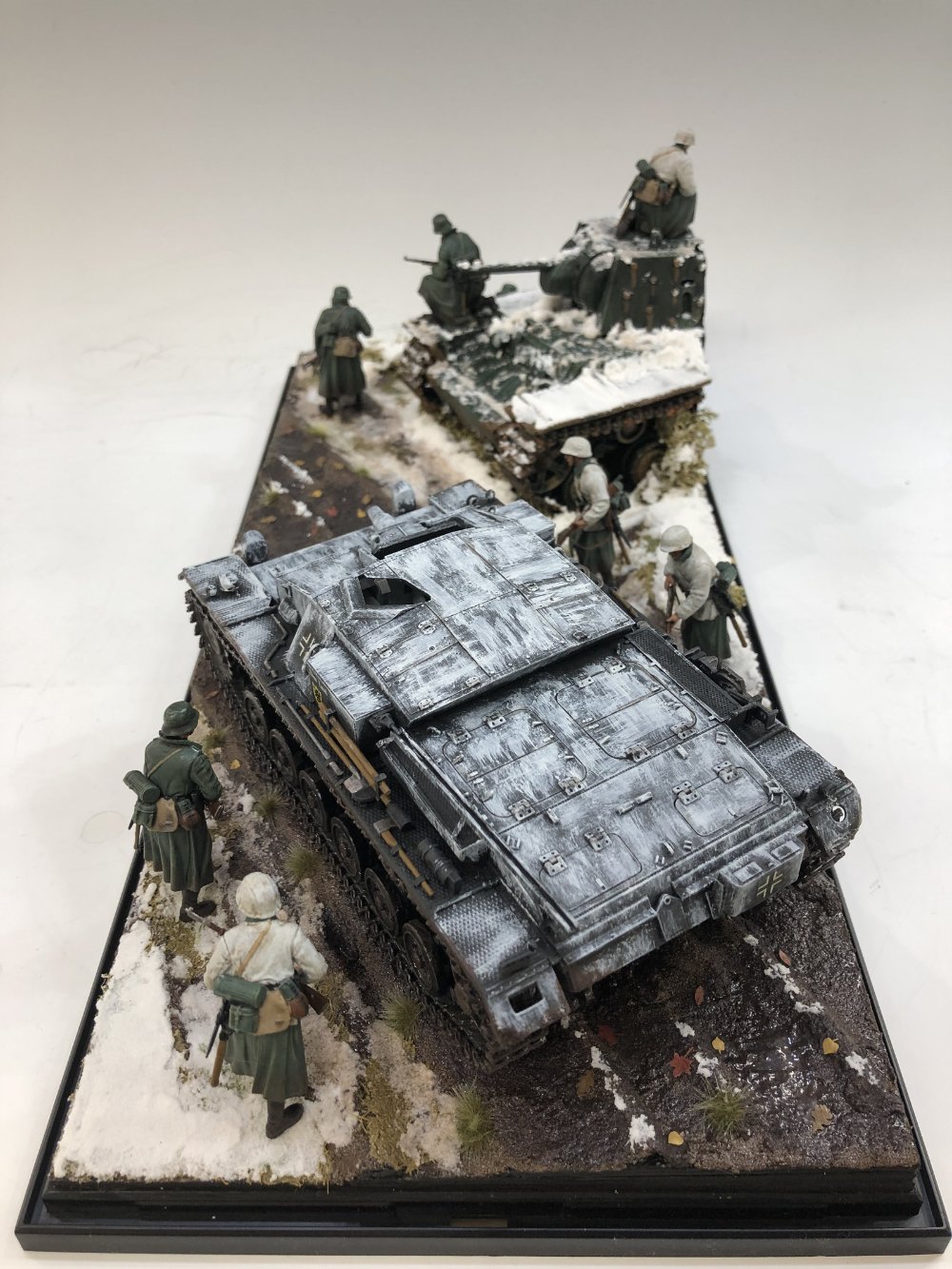 スタッフコメント:冬季迷彩を施し、ソ連侵攻を目指す三号突撃砲とドイツ兵たち。その途中でKV-1を発見し、周りを警戒しています。