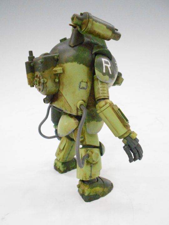 緑を基調とした迷彩風塗装、エッジの効いたマーキング、そしてリアル感溢れるウェザリングとマシーネンクリーガーの世界観に見事マッチした作品!