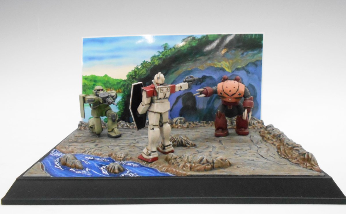 ジャブローに散る!の情景模型はMS自体の塗装だけではなく、洞窟に繋がる地面の岩肌や流れる川の塗装もしなければならない為、総合的な塗装の腕が問われますが、MSのみならず、ベースの塗装も凄く丁寧に塗装されており、あご出汁様の高い技量が伺えます。