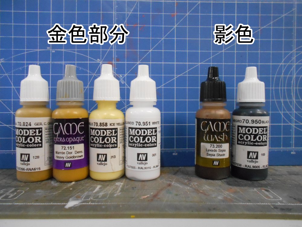 乾いたら、そこに「72151:ヘビーゴールドブラウン」を1:1で混色し、範囲を狭めて塗装。その後改めて「ヘビーゴールドブラウン」をさらに塗装範囲を狭めて塗ります。