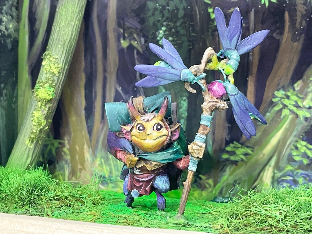 「聖杯の巡礼者」自体の塗装のクオリティの高さもさることながら、シャドーボックスの上部を開口し、透明なフィルムを貼ることで光を取り込むと共に、地面にも陰影をつけ、うっそうと茂る森の中、木々が途切れ、光が差し込む様子が表現されており、まるで1枚の絵画の様にも感じさせる素晴らしい作品です‼