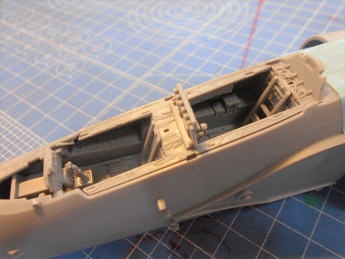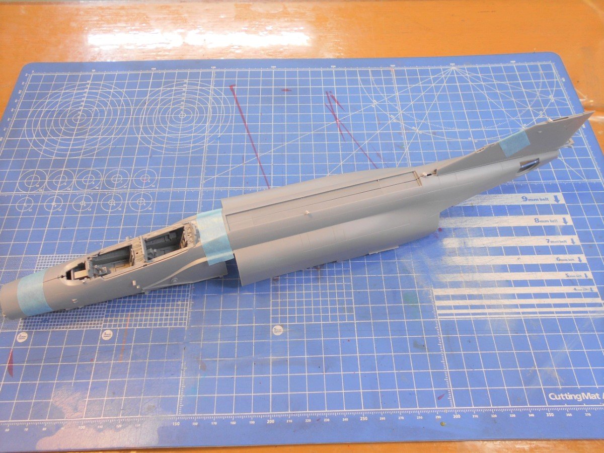 そして大迫力の一体成型の胴体パーツでコックピットを挟み込めば............戦闘機のシルエットがだいぶ見えてきます!