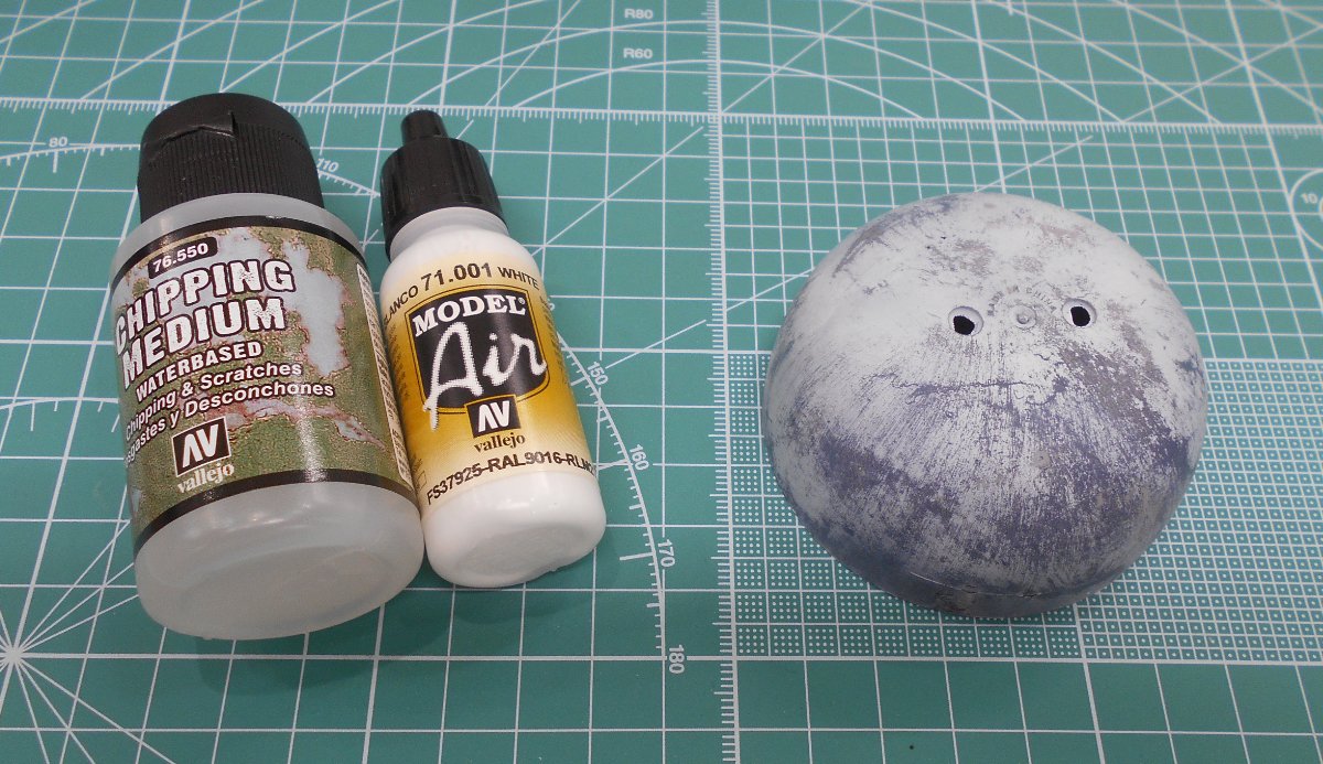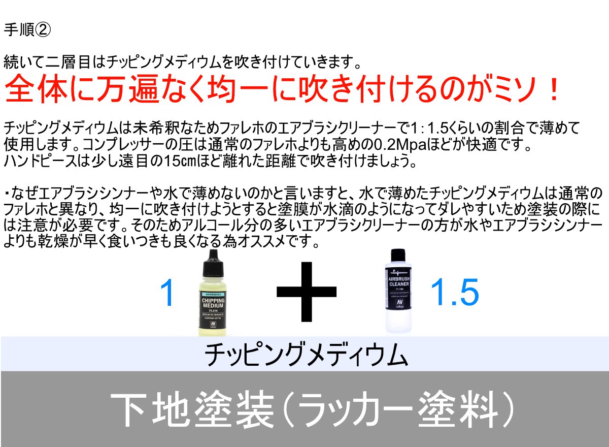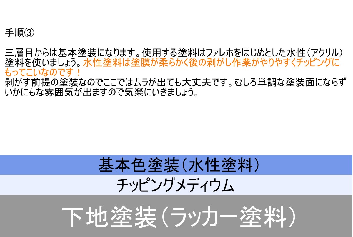 メカニズムとしては水を含ませた筆や歯ブラシなどで表面を擦ると際上面の基本塗装から内側のチッピングメディウムの塗膜まで水分が浸透します。(水性塗料を使って基本塗装を行ったのは下の層まで水が浸透しやすいからです。)