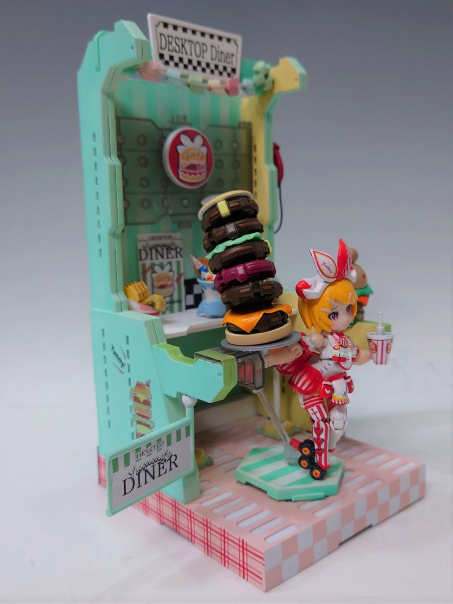 「デスクトップシンガー 鏡音リン」をベースに6体ものキットをミキシングされたというウェイトレスも、舌ペロがチャーミングで存在感抜群‼