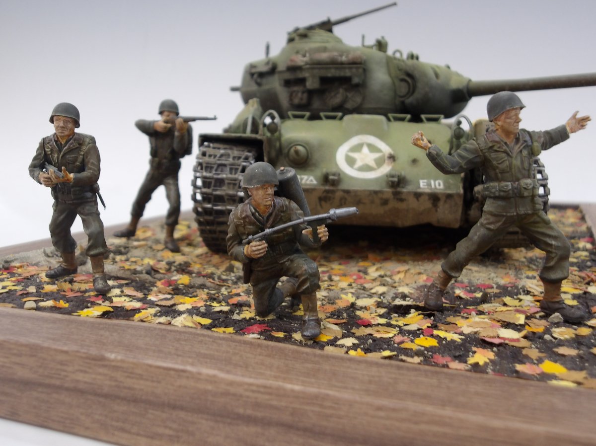 恐らく初めての挑戦で、使い慣れない材料に試行錯誤の連続であったかと思いますが、完成した作品は非常に素晴らしい出来!まず目を惹くのは無骨なシャーマン戦車、淡く退色したオリーブドラブが美しく映えます。