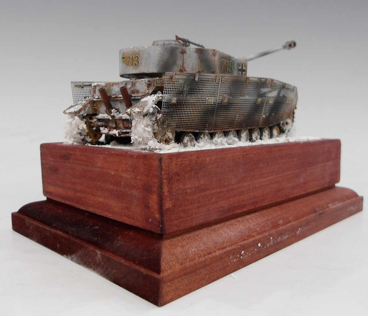プレートがあしらわれた台座も厳かな作品の雰囲気をさらに引き立てており、漆喰を使用したという雪を散りばめた履帯は臨場感たっぷり!色褪せた冬季迷彩の車体に良く映えます。