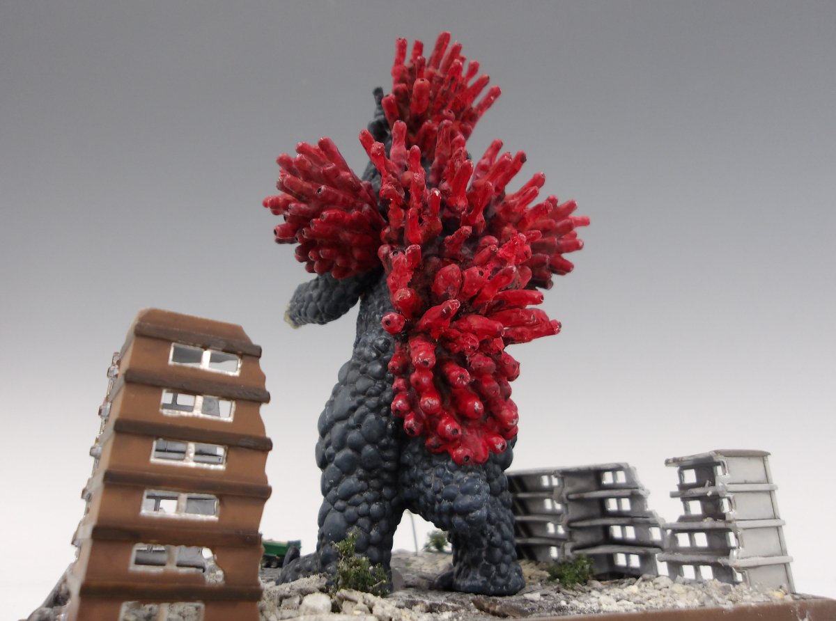 作品にはベロクロンの特徴的な赤いサンゴを思わせるミサイル部分と黒い体表の部分とでツヤの出し方を工夫するなど細かく気を配った塗装がなされており、足下に目を向けると割れたアスファルトや街路樹の作り込みも素晴らしく、限られたサイズの中にダイナミックな世界観を凝縮した作品となっております。