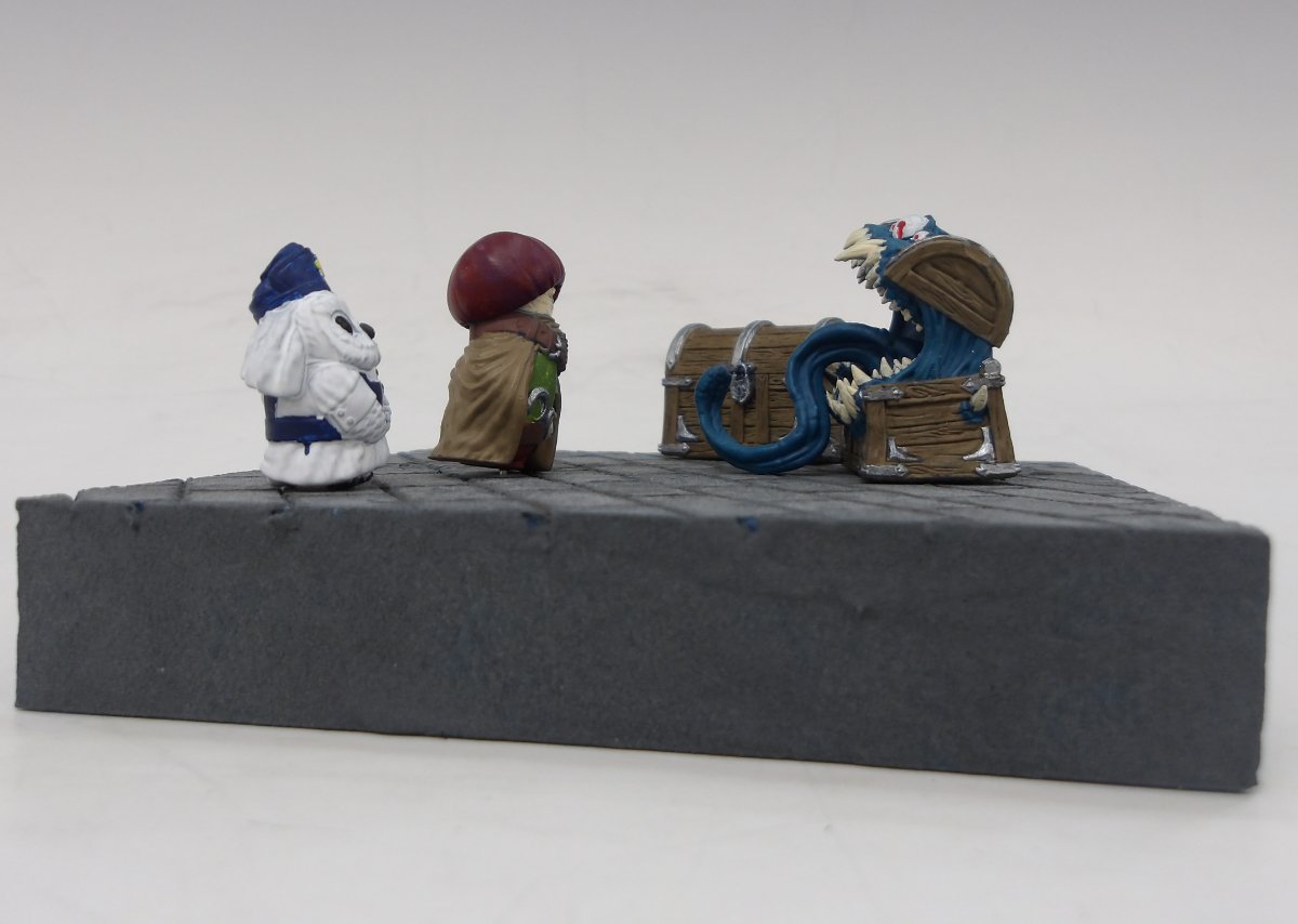 初めてのミニチュア塗装とのことですが可愛らしい冒険者一行が禍々しいミミックと鉢合わせるシーンを少ない色数で巧みに塗り上げています。