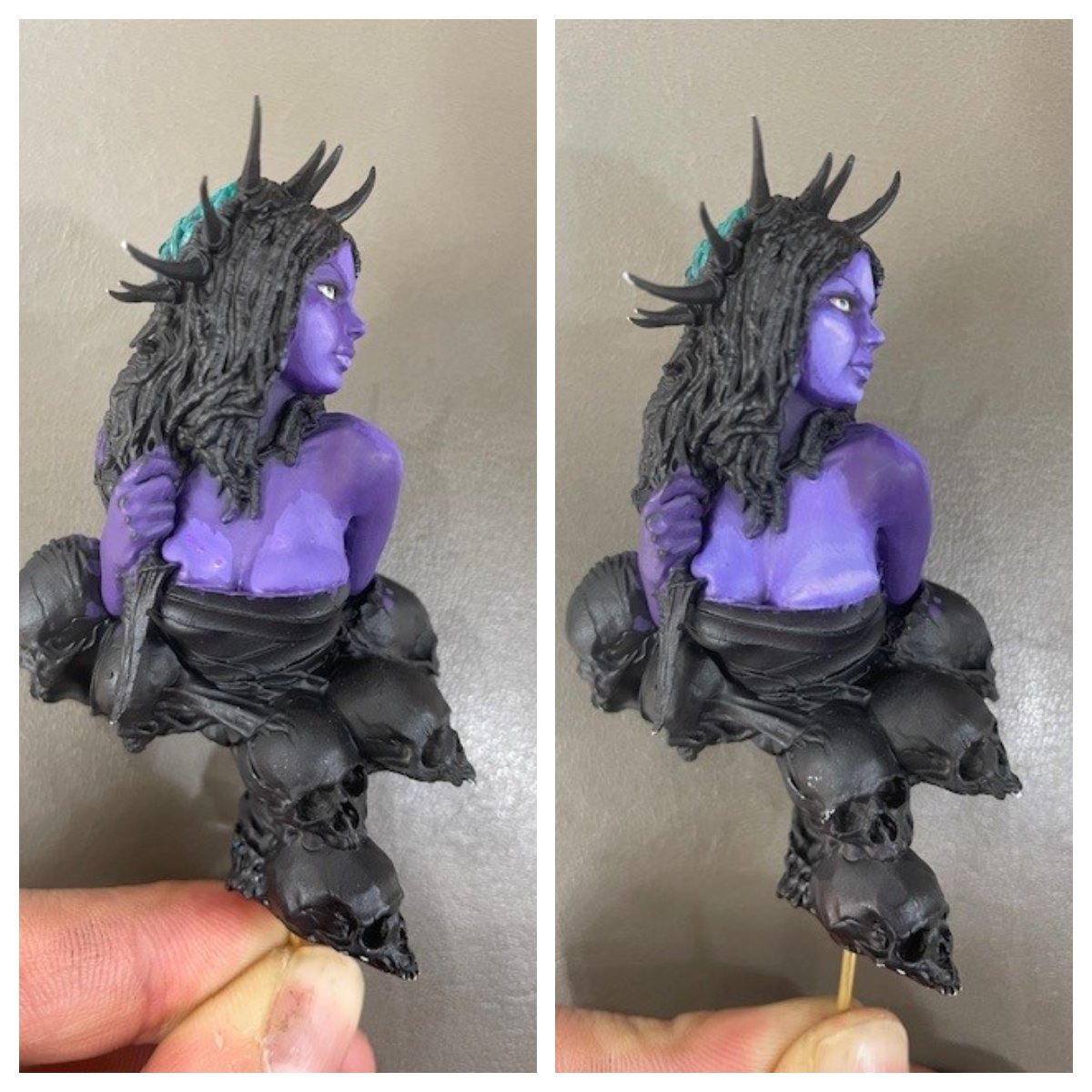 ヘックスドライケンをムラなく塗ったら、次はそこへ「72076 エーリアンパープル」を1:1の割合で混ぜ合わせたちょっと明るめの色を造形の上のほうなど、光のあたる部分へ塗り重ねます。このときベースのヘックスドライケンを塗りつぶさないようにします。