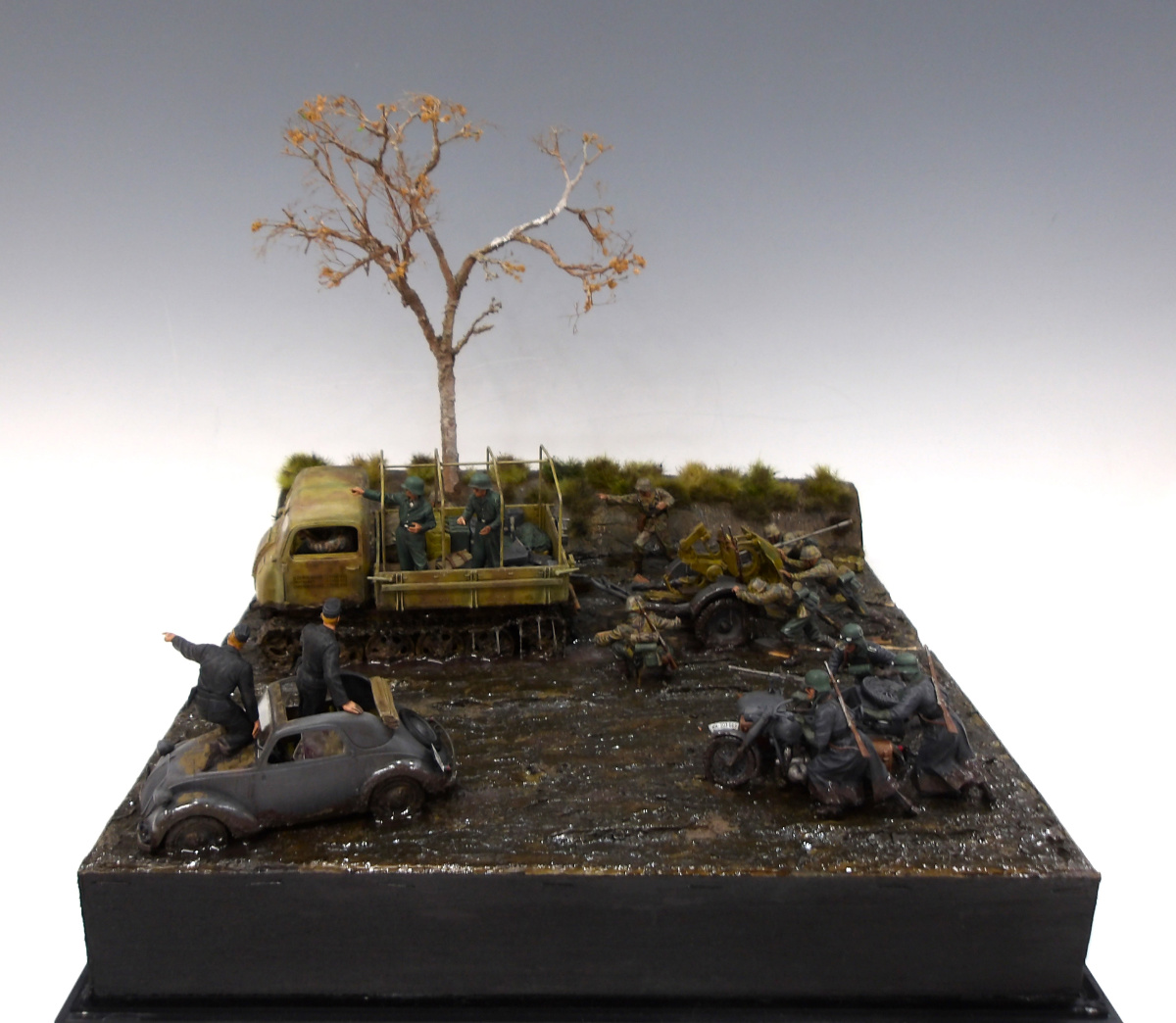 泥濘に足を取られながらも行進を続けるドイツ軍の兵士たちを制限されたサイズ内でダイナミックに表現したジオラマ作品。