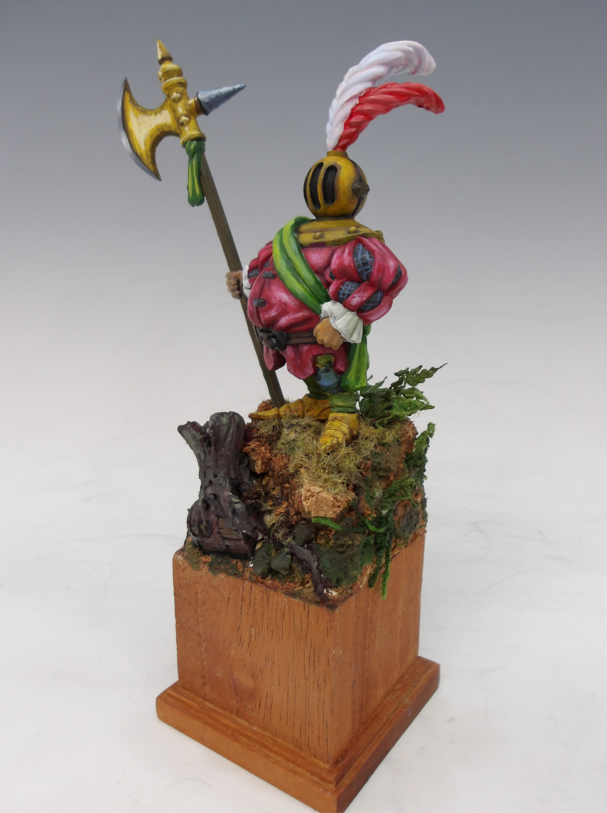 コメント:少し童話っぽい騎士をかわいく、ハデに塗りました。筆塗りでのグラデはまだまだ練習中ですが、全て筆塗りで塗装しました。かわいく、カッコよく見えたら幸いです。