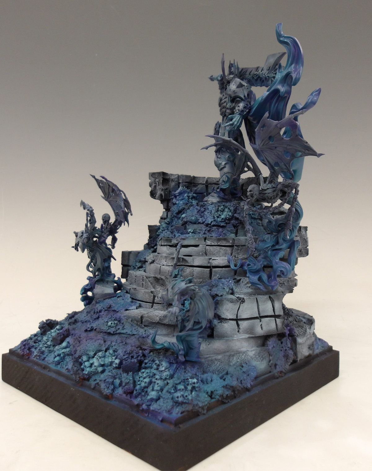 青のグラデーション塗装が際立つ作品になっております!地面には青光りする骸骨がこちらを 見ているかのよう、鎌を構えた死霊たちが今にも襲い掛かって来るかのような迫力もさることながら、頂上には死霊たちを統べた王が大剣を携えております。一目見れば虜になってしまうような素晴らしい作品になっております。