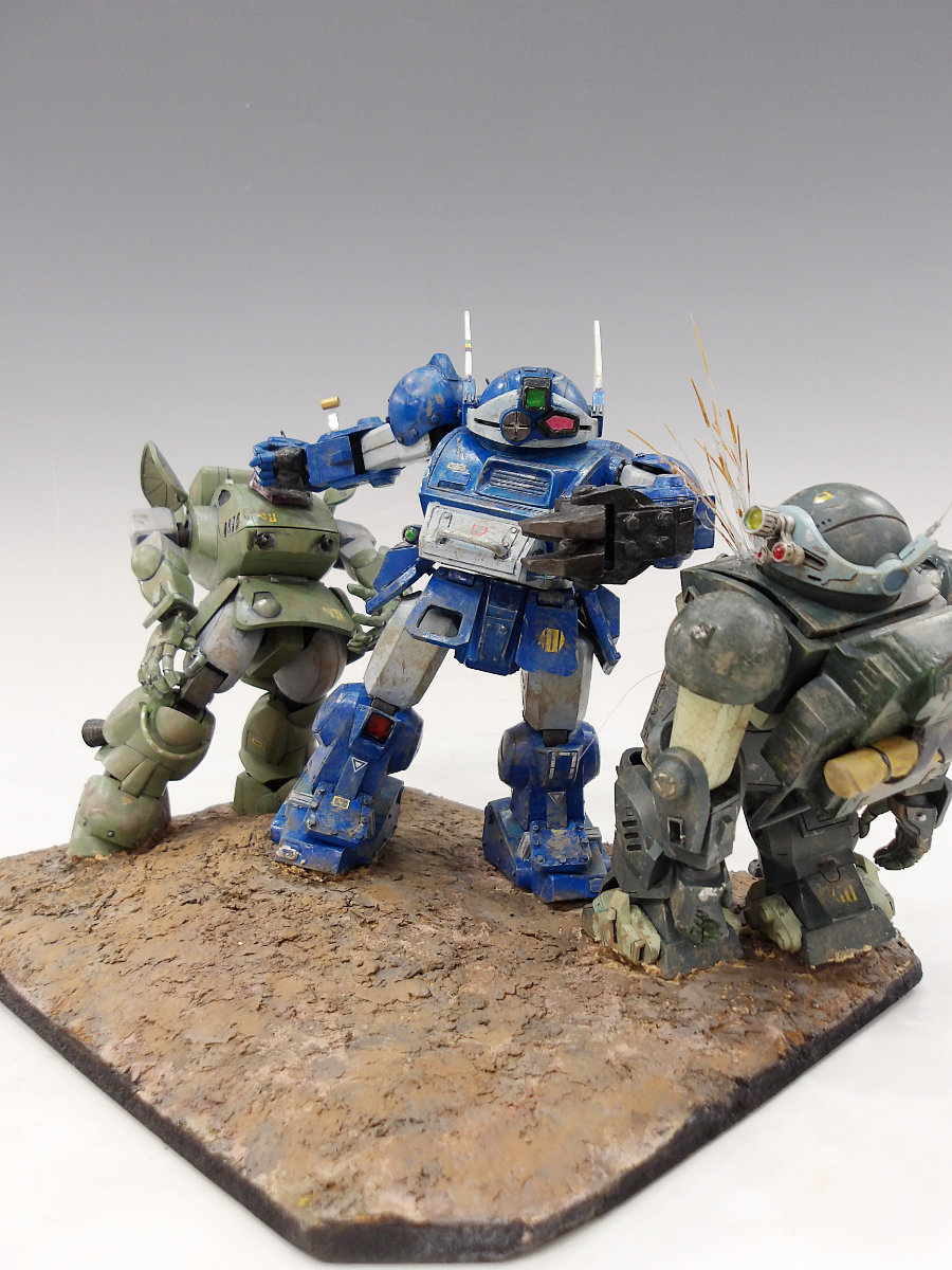 3体のATをも塗装した上でボトムズの世界観にピッタリな台座を用意し、更にアームパンチの薬莢や殴りつけた際の火花などエフェクトまで加えた手の込みっぷり。