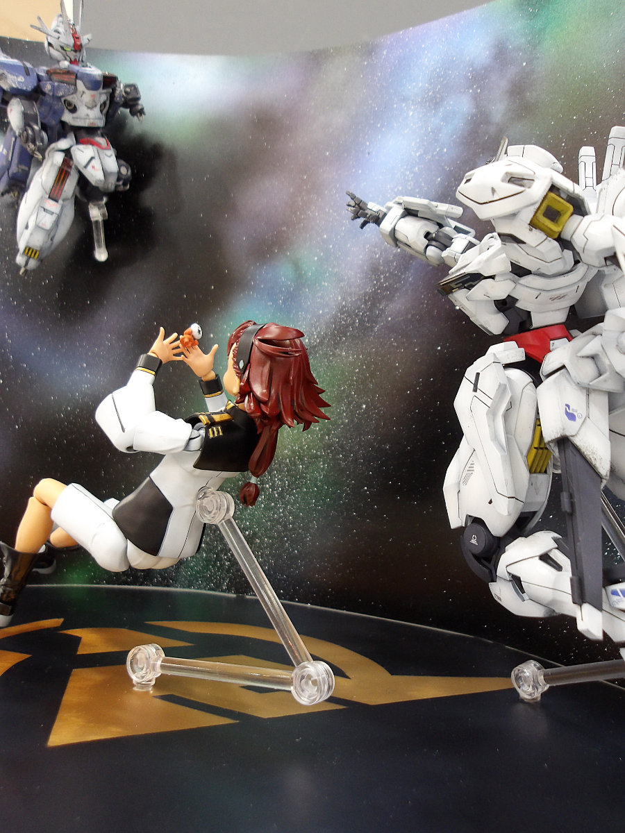 工作で再現した大破したガンダムエアリアル、手を伸ばすガンダムキャリバーン、ヒロイックな