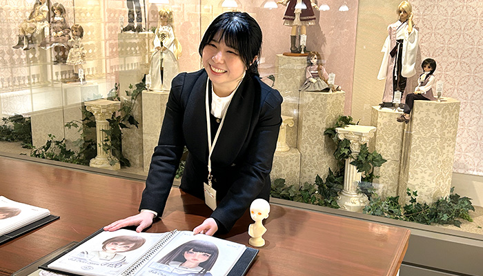 父が作ったドールハウスで、母が仕立てたドレスを着せてお人形遊びをしながら育った私は、美術系の大学へ進学し、独学で等身大の球体関節人形を制作していく中で”ドール”の魅力に取りつかれいきました。そんな中「京都には日本庭園に囲まれた会員制のお人形の美術館がある」という噂を聞き興味を持ったことをきっかけにこの会社の門を叩きました。